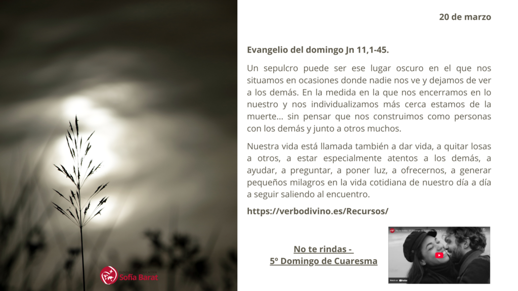 Un sepulcro puede ser ese lugar oscuro en el que nos situamos en ocasiones donde nadie nos ve y dejamos de ver a los demás. En la medida en la que nos encerramos en lo nuestro y nos individualizamos más cerca estamos de la muerte… sin pensar que nos construimos como personas con los demás y junto a otros muchos.
