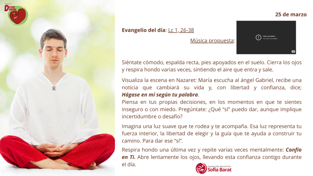 Visualiza la escena en Nazaret: María escucha al ángel Gabriel, recibe una noticia que cambiará su vida y, con libertad y confianza, dice; Hágase en mí según tu palabra.